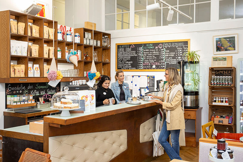 Here you will not only get the best coffee roasted in Vienna, but also various delicacies from the in-house gourmet workshop: All organic and sustainably produced. In addition, you will find handmade products made of wood, fashion and accessories made of GOTS-certified fabrics and many other beautiful & good things from our own production or from our handpicked partners. Click on the photo to the right for a digital tour through our store! As you can see, there is a lot to discover in our shop. Now that you have a virtual taste, we look forward to your analog visit to our Social Concept Store!